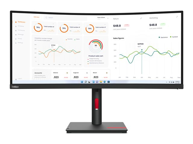 Produktbeskrivning Lenovo ThinkVision T34w-30 - LED-skärm - böjd - 34" Typ av enhet LED-bakgrundsbelyst LCD-skärm - 34" URL med QR-kod för energimärke Https://eprel.ec.europa.eu/qr/1340979 Energiklass Klass F Böjd skärm Ja Egenskaper USB 3.2 Gen 1 hubb, USB PD 75 Watt Paneltyp VA Bildförhållande 21:9 Ursprunglig upplösning UWQHD 3440 x 1440 Pixelhöjd 0.232 mm Ljusstyrka 350 cd/m² Kontrastförhållande 3000:1 / 3000000:1 (dynamisk) Responstid 4 ms (extrem), 6 ms (normalt) Färgstöd 16,7 miljoner färger Färgskala 99% sRGB Inmatningsanslutningar HDMI, DisplayPort, USB-C Inbyggt Ethernet Ja Displaylägesjusteringar Höjd, vridbar bas, lutning Skärmbeläggning Bländskydd Spänning AC 100-240 V (50/60 Hz) Färg Korpsvart Dimensioner (BxDxH) - med stativ (högsta position) 80.84 cm x 23.16 cm x 56.93 cm Vikt 9.5 kg Lokalisering Engelska / Europa Miljöstandarder TCO Certified Edge Displays, TCO Certified Displays 9, ENERGY STAR-godkänd EPEAT Gold Standarder som följs CCC, RoHS, TUV Rheinland Eye Comfort Certification, China Energy standard Tier 1, TUV Rheinland Low Blue Light (Hardware Solution) Tillverkarens garanti 3 års garanti -