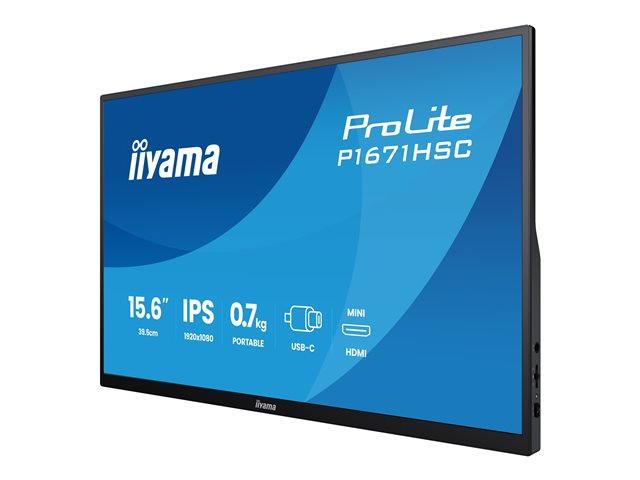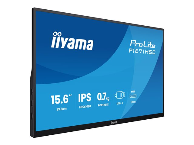 Produktbeskrivning iiyama ProLite P1671HSC-B1 - LED-skärm - Full HD (1080p) - 15.6" Typ av enhet LED-bakgrundsbelyst LCD-skärm - 15.6" URL med QR-kod för energimärke Https://eprel.ec.europa.eu/qr/2443075 Energiklass Klass D Paneltyp IPS Bildförhållande 16:9 Ursprunglig upplösning Full HD (1080p) 1920 x 1080 vid 60 Hz Pixelhöjd 0.17925 mm Ljusstyrka 250 cd/m² Kontrastförhållande 1000:1 / 5000000:1 (dynamisk) Responstid 3 ms (grå-till-grå) Färgstöd 16,7 miljoner färger Färgskala 99% sRGB, 72% NTSC Inmatningsanslutningar Mini HDMI, USB-C Displaylägesjusteringar Lutning Skärmbeläggning Matt Spänning AC 100-240 V (50/60 Hz) Färg Svart, matt Dimensioner (BxDxH) 35.6 cm x 1.2 cm x 21.1 cm Vikt 700 g Standarder som följs RoHS, WEEE, REACH, TUV Bauart, ERP, EAC, CE/EMC -