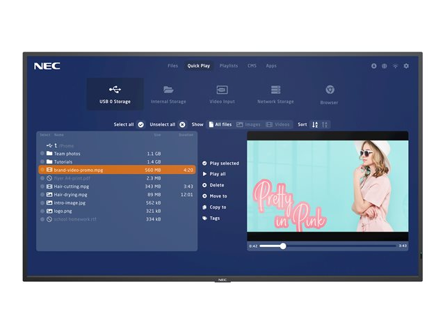 Produktbeskrivning NEC MultiSync MA431-MPi4 MA Series - 43" LED-bakgrundsbelyst LCD-skärm - 4K - för digital skyltning Typ av produkt LED-bakgrundsbelyst, platt LCD-skärm Diagonalklass 43" Kommersiell användning Ja - digital skyltning Färg Svart, pantone 426M Upplösning 3840 x 2160 Visningsformat 4K UHD (2160p) Rampris och förhöjningsteknologi 60 Hz Refresh Rate Videogränssnitt HDMI HDMI-portskvantitet 2 portar Anknytningsbarhet LAN PC-gränssnitt HDMI, DisplayPort Teknik IPS LCD-teknik för bakgrundsbelysning Kant-LED lokal dimning Bildkvot 16:9 TV-tuner Ingen mottagare Kommersiella funktioner SNMP-support Bildförbättringar DICOM simulerad gamma Lagringskapacitet 32GB eMMC USB Ja Inkluderade tillbehör Fjärrkontroll Spänning AC 120/230 V (50/60 Hz) Energiklass Klass G Energiförbrukning vid drift 70 Watt Strömkonsumtionsställ med 0.5 Watt Energikonsumtion per år 124 kWh Dimensioner (BxDxH) 96.82 cm x 6.71 cm x 56.1 cm Vikt 18.5 kg Tillverkarens garanti 3 års garanti -