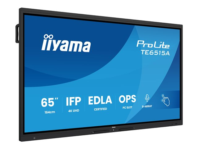 Produktbeskrivning iiyama ProLite TE6515A-B2AG 65" Klass (64.5" visbar) LED-bakgrundsbelyst LCD-skärm - 4K - för interaktiv skyltning/interaktiv kommunikation Typ av produkt LED-bakgrundsbelyst, platt LCD-skärm med beröringsskärm (multi touch) / 8-mikrofonarray / valbar slot-in PC-funktionalitet URL med QR-kod för energimärke Https://eprel.ec.europa.eu/qr/2481192 Diagonalklass 65" Diagonalstorlek 64.5" Kommersiell användning Ja - interaktiv digital skyltning Färg Svart ram med matta ytor Upplösning 3840 x 2160 Visningsformat 4K UHD (2160p) Rampris och förhöjningsteknologi 60 Hz Refresh Rate Videogränssnitt HDMI HDMI-portskvantitet 2 portar Anknytningsbarhet LAN, Wi-Fi, Bluetooth PC-gränssnitt DisplayPort, USB-C Teknik VA LCD-teknik för bakgrundsbelysning LED-bakgrundsbelysning Bildkvot 16:9 TV-tuner Ingen mottagare Bildförbättringar 72 % färgomfång NTSC Högtalarsystem 2 högtalare, bashögtalare Lagringskapacitet 128 GB Minneskort som stöds microSD USB Ja Inkluderade tillbehör Fjärrkontroll, 4 pekpennor, Wall Mounting Bracket (VESA 600x400), monteringsfäste för webbkamera, 6 kabelknutar Spänning AC 100-240 V (50/60 Hz) Energiförbrukning vid drift 170 Watt Strömkonsumtionsställ med 0.5 Watt Dimensioner (BxDxH) - utan ställ 148.91 cm x 8.71 cm x 91.18 cm Vikt 43.5 kg Tillverkarens garanti 5 års garanti -