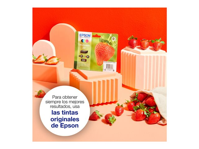 Produktbeskrivning Epson 29 Multipack - 4-pack - svart, gul, cyan, magenta - original - bläckpatron Typ av produkt Bläckpatron Utskriftsteknik Bläckstråle Utskriftsfärg Svart, gul, cyan, magenta Egenskaper för tonerkassett Epson Claria Home Ink Avkastning Upp till 175 sidor (svart)