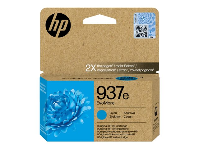 Produktbeskrivning HP 937e EvoMore - cyan - original - bläckpatron Typ av produkt Bläckpatron Utskriftsteknik Bläckstråle Utskriftsfärg Cyan Avkastning Upp till 1 650 sidor ISO/IEC 24711 Kompatibel med Officejet Pro 9110b -