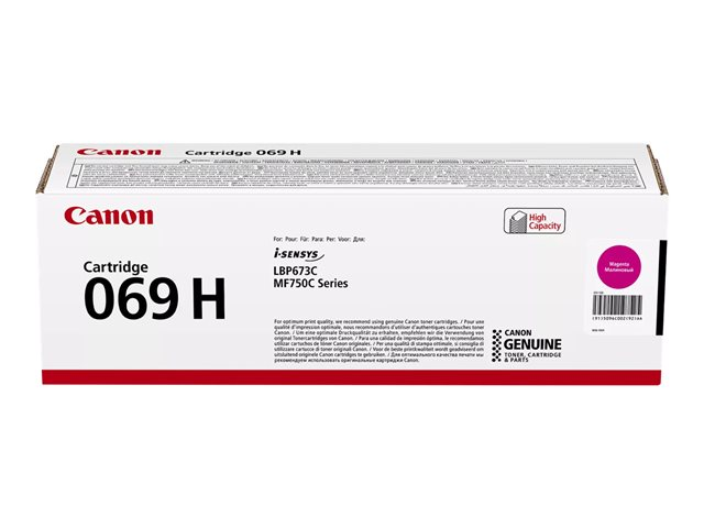 Produktbeskrivning Canon 069H - Lång livslängd - magenta - original - tonerkassett Typ av produkt Tonerkassett Utskriftsteknik Laser Utskriftsfärg Magenta Kassettens kapacitet Lång livslängd Avkastning Upp till 5500 sidor Förpackningstyp Box Tillverkarens garanti 30-dagars retur Kompatibel med I-SENSYS LBP673Cdw, LBP673dw, MF752Cdw, MF754Cdw -