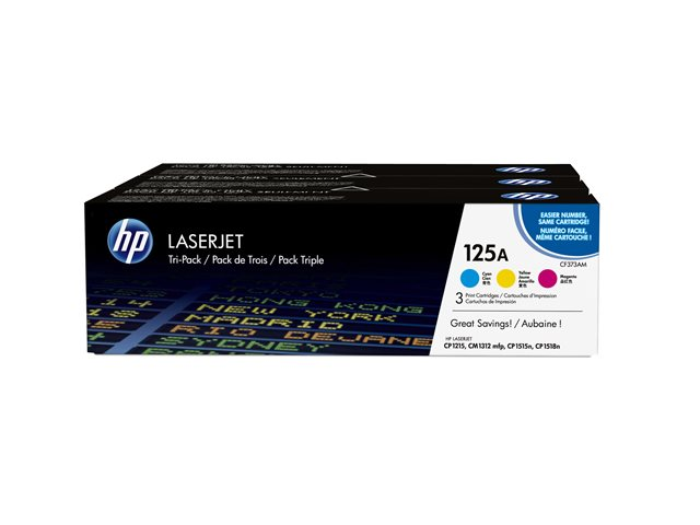 Produktbeskrivning HP 125A - 3-pack - gul, cyan, magenta - original - LaserJet - tonerkassett (CE259AM) Typ av produkt Tonerkassett Utskriftsteknik Laser HP-submärke LaserJet Utskriftsfärg Gul, cyan, magenta Egenskaper för tonerkassett HP ColorSphere Avkastning Upp till 1400 sidor ISO/IEC 19798 Medföljande antal 3-pack Kompatibel med Color LaserJet CM1312 MFP, CM1312nfi MFP, CP1215, CP1515n, CP1518ni -