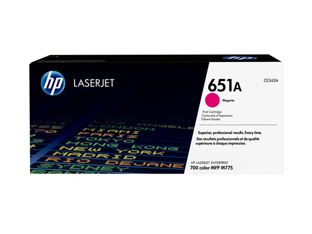 Produktbeskrivning HP 651A - magenta - original - LaserJet - tonerkassett (CE343A) Typ av produkt Tonerkassett Utskriftsteknik Laser HP-submärke LaserJet Utskriftsfärg Magenta Avkastning Upp till 16000 sidor ISO/IEC 19798 Kompatibel med Color LaserJet Enterprise MFP M775dn, MFP M775f, MFP M775z, MFP M775z+; LaserJet Managed MFP M775fm, MFP M775zm -