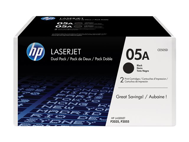 Produktbeskrivning HP 05A - 2-pack - svart - original - LaserJet - tonerkassett (CE505D) Typ av produkt Tonerkassett Utskriftsteknik Laser HP-submärke LaserJet Utskriftsfärg Svart Avkastning Upp till 2300 sidor ISO/IEC 19752 Medföljande antal 2-pack Kompatibel med LaserJet P2055 -