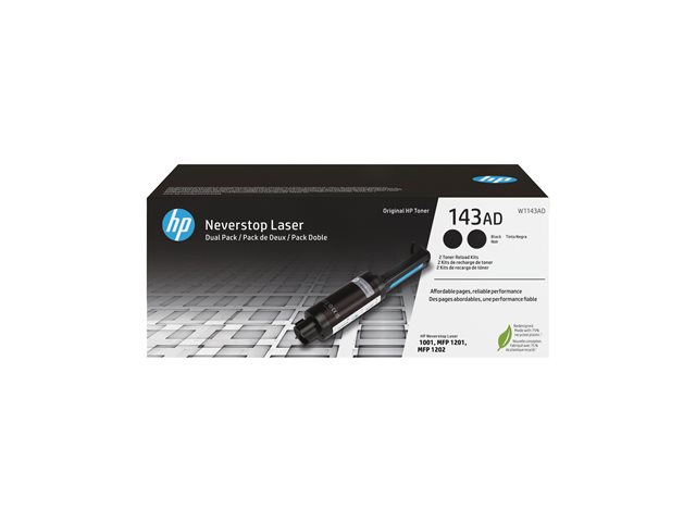 Produktbeskrivning HP 143AD - 2-pack - svart - toner-refill Typ av produkt Toner-refill Utskriftsteknik Laser Utskriftsfärg Svart Avkastning Upp till 2500 sidor ISO/IEC 19752 Medföljande antal 2-pack Kompatibel med Neverstop 1001nw, 1001nw Cartridge-Free Laser Tank, 1202nw Cartridge-Free Laser Tank, 1202w Cartridge-Free Laser Tank; Neverstop Laser 1000a, 1000n, 1000w, MFP 1200a, MFP 1200n, MFP 1200nw, MFP 1200w, MFP 1201n, MFP 1202nw -