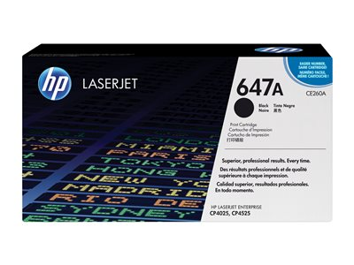 Produktbeskrivning HP 647A - svart - original - LaserJet - tonerkassett (CE260A) Typ av produkt Tonerkassett Utskriftsteknik Laser HP-submärke LaserJet Utskriftsfärg Svart Avkastning Upp till 8500 sidor ISO/IEC 19798 Kompatibel med Color LaserJet Enterprise CM4540 MFP, CM4540f MFP, CM4540fskm MFP, CP4025dn, CP4025n, CP4525dn, CP4525n, CP4525xh -