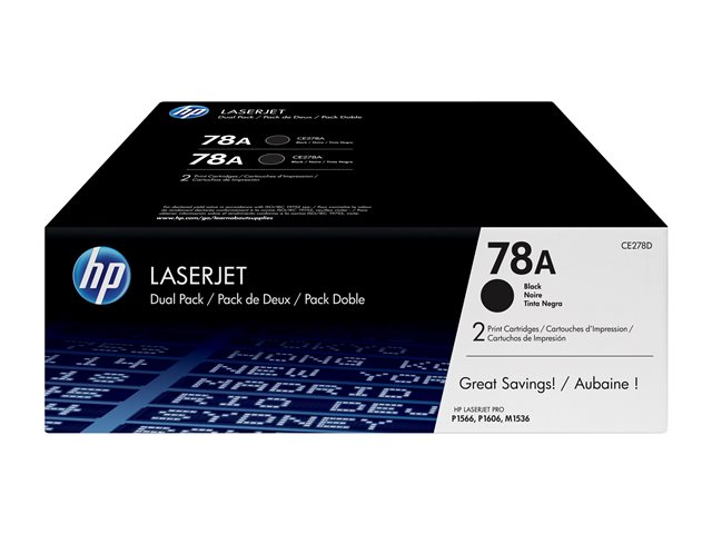 Produktbeskrivning HP 78A - 2-pack - svart - original - LaserJet - tonerkassett (CE278AD) Typ av produkt Tonerkassett Utskriftsteknik Laser HP-submärke LaserJet Utskriftsfärg Svart Egenskaper för tonerkassett HP Smart Printing Avkastning Upp till 2100 sidor ISO/IEC 19752 Medföljande antal 2-pack Kompatibel med LaserJet Pro M1536dnf, P1566, P1606DN -