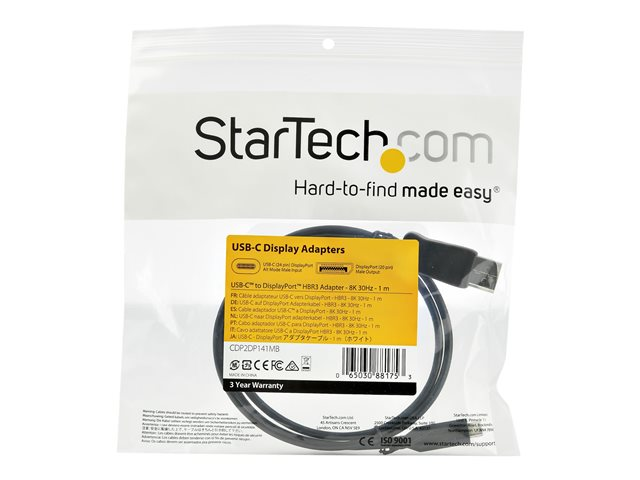 Produktbeskrivning StarTech.com 3.3ft/1m USB C to DisplayPort 1.4 Cable, 4K/5K/8K USB Type-C to DP 1.4 Alt Mode Video Adapter Converter, HBR3/HDR/DSC, 8K 60Hz DP 1.4 Monitor Cable for USB-C and Thunderbolt 3 - USB-C to DP 8K Cable (CDP2DP141MB) - extern videoadapter - svart Typ av enhet Extern videoadapter Busstyp USB-C Max upplösning 7680 x 4320 Gränssnittsdetaljer DisplayPort (hankontakt) Kabellängd 1 m Färg Svart Tillverkarens garanti 3 års garanti Designat för P/N: TB4CDOCK -