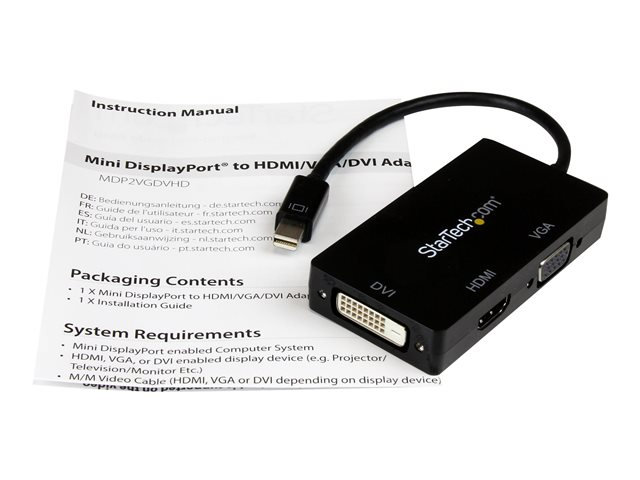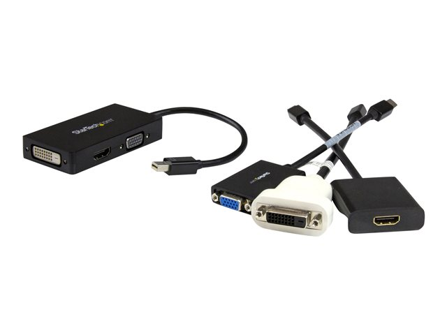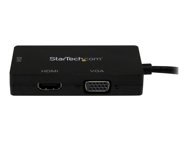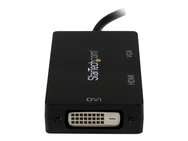 Produktbeskrivning StarTech.com A/V-reseadapter: 3-i-1 Mini DisplayPort till VGA-, DVI- eller HDMI-konverterare - videokort - Mini DisplayPort / HDMI / DVI / VGA - 27 cm Kabel Videokort - Mini DisplayPort / HDMI / DVI / VGA Max effektupplösning 1920 x 1200 Kabellängd 27 cm Färg Svart Kontakter Mini DisplayPort - hane Kontakter (andra änden) HDMI - hona