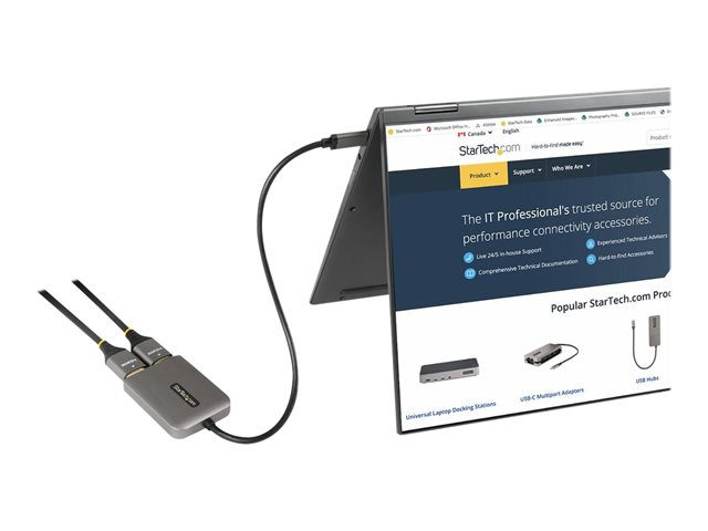 Produktbeskrivning StarTech.com USB-C to Dual HDMI MST HUB, Dual HDMI 4K 60Hz, USB Type C Multi Monitor Adapter for Laptop w/ 1ft (30cm) cable, DP 1.4 Multi-Stream Transport Hub, USB Type C to 2x HDMI Ports - USB-C to HDMI Splitter (MST14CD122HD) - videokort - DisplayPort / HDMI Kabel Videokort - DisplayPort / HDMI Max effektupplösning 3840 x 2160 - 60 Hz Färg Grå Kontaktdon USB-C - hane Kontakt (andra änden) 2 x HDMI - hona Standarder som följs DisplayPort 1.4 Egenskaper Display Stream Compression (DSC), HBR3-ljudstöd, Multi Stream Transport (MST), 7.1 kanalers surroundljud, DisplayPort Alternate Mode-support Tillverkarens garanti 3 års garanti -