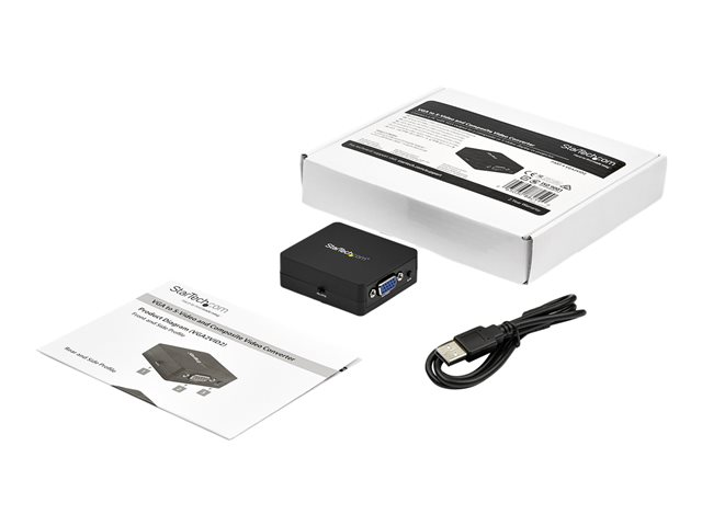 Produktbeskrivning StarTech.com VGA till RCA och S-Video-konverterare - USB Power - videokort - VGA/S-video/kompositvideo Kabel Videokort - VGA/S-video/kompositvideo Max effektupplösning 640 x 480 - 60 Hz Färg Svart Kontakter HD-15 (VGA) - hona Kontakter (andra änden) 4-stifts mini-DIN - hona