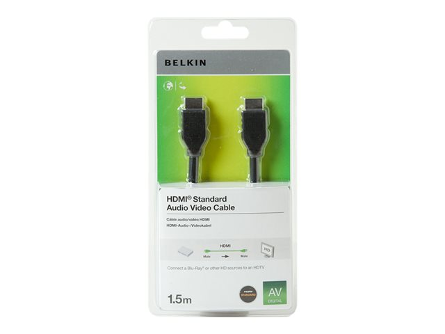 Produktbeskrivning Belkin Standard HDMI-kabel - 1.5 m Kabel HDMI-kabel Teknik Dubbelt skärmad Längd 1.5 m Färg Svart Kontaktdon HDMI - hane Kontakt (andra änden) HDMI - hane Egenskaper Stöd för 4K -