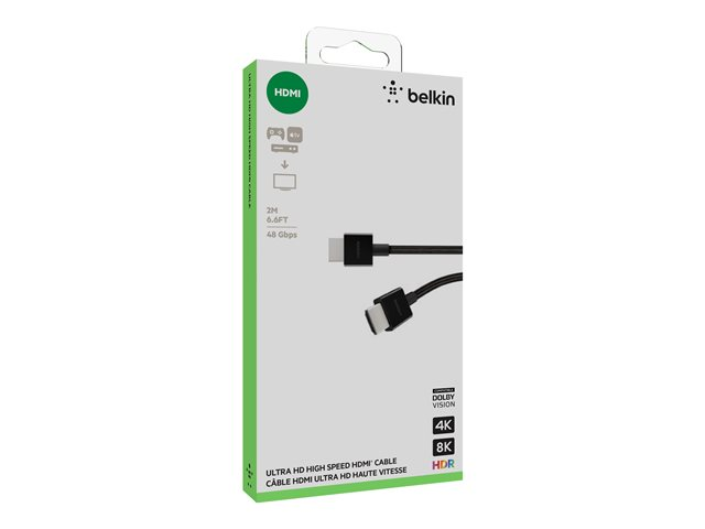 Produktbeskrivning Belkin HDMI-kabel - 2 m Kabel Ultra High Speed - HDMI-kabel Kabellängd 2 m Färg Svart Kontaktdon HDMI - hane Kontakt (andra änden) HDMI - hane Egenskaper Flätad -