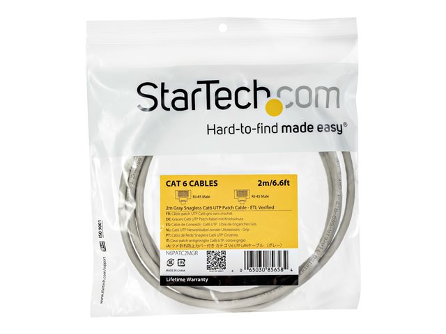 Produktbeskrivning StarTech.com 2m CAT6 Ethernet Cable, 10 Gigabit Snagless RJ45 650MHz 100W PoE Patch Cord, CAT 6 10GbE UTP Network Cable w/Strain Relief, Grey, Wiring is UL Certified/TIA - Category 6 - 24AWG (N6PATC2MGR) - patch-kabel - 2 m - grå Typ Patch-kabel - CAT 6 Teknik UTP (oskärmat tvinnat par) Kablageschema T568B Egenskaper Hakfri, minimerad Near-End Crosstalk (NEXT) Kabellängd 2 m Kontaktdon RJ-45 - hane Kontakt (andra änden) RJ-45 - hane Färg Grå Tillverkarens garanti Begränsad livstidsgaranti -