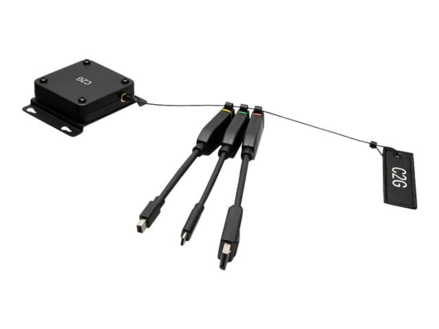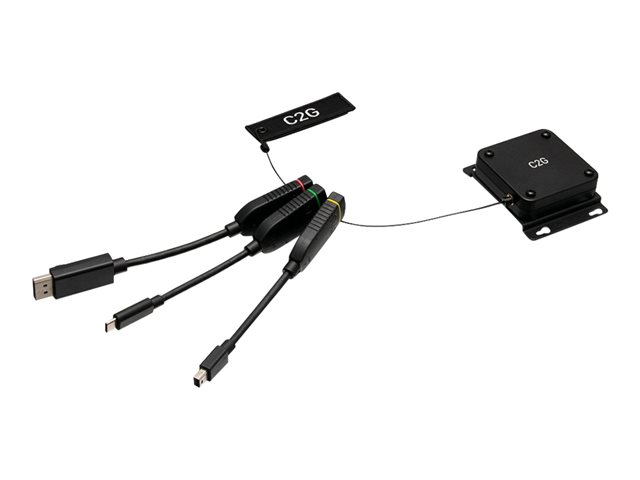 Produktbeskrivning C2G 4K HDMI Dongle Adapter Ring with Mini DisplayPort, DisplayPort, and USB C - Retractable Universal Mount - videoadaptersats - Minivisningsport/visningsport/HDMI/USB Kabel Videoadaptersats - Minivisningsport/visningsport/HDMI/USB Inkluderad kvantitet 3 Färg Svart Egenskaper Stöd för 4K Tillverkarens garanti Begränsad livstidsgaranti -