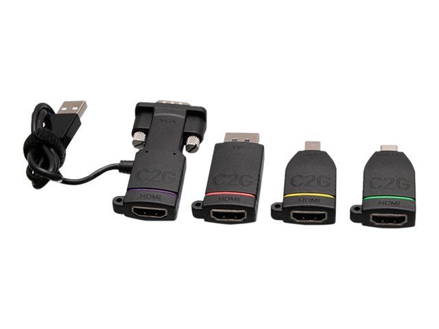 Produktbeskrivning C2G Universal 4K HDMI Adapter Ring with Mini DisplayPort, DisplayPort, USB C, Lightning, and VGA - M/F - videoadaptersats - Mini DisplayPort / DisplayPort / HDMI / USB / VGA Kabel Videoadaptersats - Mini DisplayPort / DisplayPort / HDMI / USB / VGA Inkluderad kvantitet 4 Färg Svart Egenskaper Stöd för 4K Tillverkarens garanti Begränsad livstidsgaranti -
