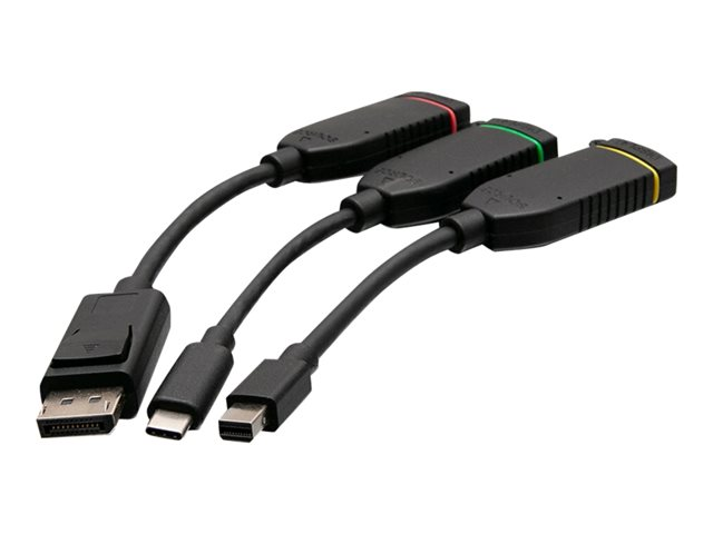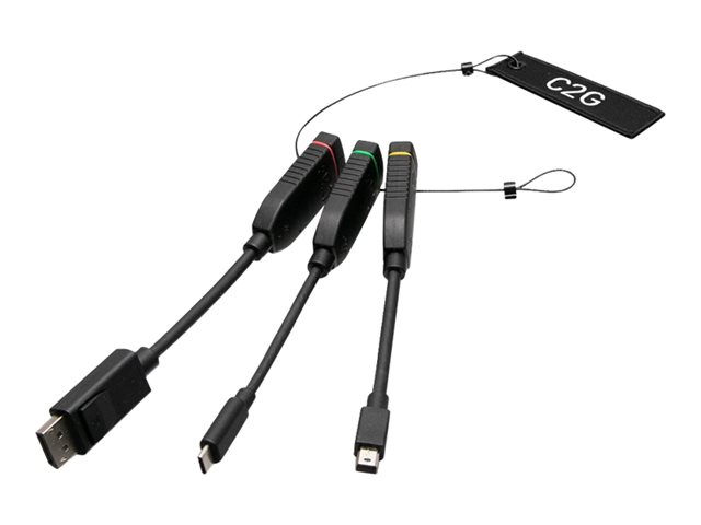 Produktbeskrivning C2G Universal 4K HDMI Dongle Adapter Ring with Color Coded Mini DisplayPort, DisplayPort, and USB-C - videoadaptersats - Minivisningsport/visningsport/HDMI/USB Kabel Videoadaptersats - Minivisningsport/visningsport/HDMI/USB Inkluderad kvantitet 3 Färg Svart Egenskaper Stöd för 4K Tillverkarens garanti Begränsad livstidsgaranti -