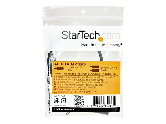 Produktbeskrivning StarTech.com 4 Position to 2x 3 Position 3.5mm Headset Splitter Adapter - headset-delare - 20 cm Kabel Headset-delare American Wire Gauge (AWG) 28 Kabellängd 20 cm Färg Svart Kontaktdon 4-poligt minijack - hane Kontakt (andra änden) 2 x minijack - hona Tillverkarens garanti Begränsad livstidsgaranti Designat för P/N: DK30A2DH, DK30CHDDPPD, DK30CHDPPDUE, MST30C2HDPPD, MUHSMF2M, USB3DDOCKFT, USB3DOCKHDPC, USB3SMDOCK4K, USB3VDOCK4DP, USB3VDOCKD -