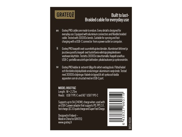 Produktbeskrivning GRATEQ PRO - USB typ C-kabel - USB-C till USB-C - 2.25 m Typ USB typ C-kabel Egenskaper USB-strömförsörjning (240W), synkronisering och laddning, skärmad, Quick Charge 3.0, stöd för snabbladdning, programmerbar strömförsörjning (PPS), stöd för supersnabb laddning, tål 30 000 böjar, aluminiumkontakter Kabellängd 2.25 m Kontaktdon 24 pin USB-C - hane Kontakt (andra änden) 24 pin USB-C - hane - vinklad 90 grader Märkström 5 A Färg Vit -