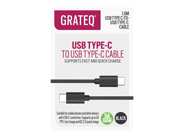 Produktbeskrivning GRATEQ - USB typ C-kabel - 24 pin USB-C till 24 pin USB-C - 1 m Typ USB typ C-kabel Egenskaper USB-strömförsörjning (100W), Quick Charge 3.0, stöd för snabbladdning Kabellängd 1 m Kontaktdon 24 pin USB-C - hane Kontakt (andra änden) 24 pin USB-C - hane Märkström 5 A Färg Svart -