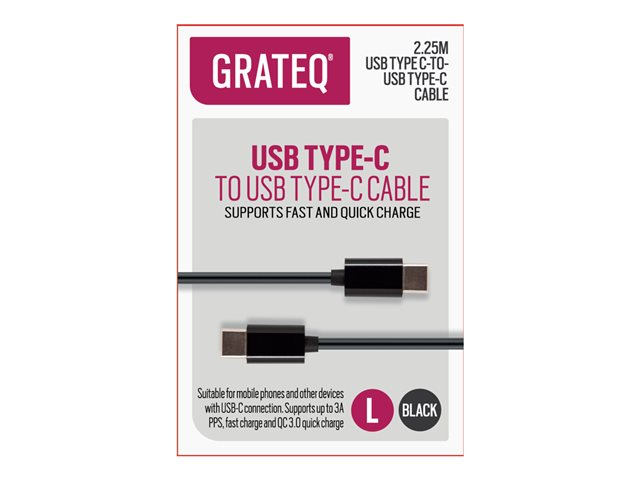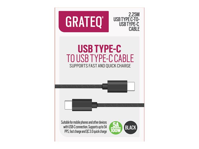 Produktbeskrivning GRATEQ - USB typ C-kabel - 24 pin USB-C till 24 pin USB-C - 2.25 m Typ USB typ C-kabel Egenskaper USB-strömförsörjning (100W), Quick Charge 3.0, stöd för snabbladdning Kabellängd 2.25 m Kontaktdon 24 pin USB-C - hane Kontakt (andra änden) 24 pin USB-C - hane Märkström 5 A Färg Svart -