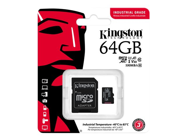 Produktbeskrivning Kingston Industrial - flash-minneskort - 64 GB - mikroSDXC UHS-I Produkttyp Flash-minneskort Formfaktor mikroSDXC UHS-I minneskort Minneskapacitet 64 GB Hastighet A1 / Video Class V30 / UHS-I U3 / Class10 Teknik TLC NAND Flash Minnesadapter som medföljer microSDXC till SD-adapter Tillverkarens garanti 3 års garanti -