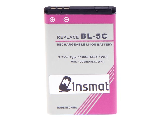 Produktbeskrivning Insmat batteri - Li-Ion Typ av produkt Batteri Batteri Litiumjon - 1100 mAh - 4.1 Wh Batteritillverkare Nokia BL-5C Designat för Nokia 105, 107, 111, 11XX, 12XX, 130, 1315, 16XX, 1800, 207, 208, 215, 21XX, 222, 22XX, 23XX, 26XX, 27XX, 31XX, 36XX, 5030, 5130, 60XX, 61XX, 62XX, 6555, 66XX, 68XX, 7610, C1, C2, E50, E60, N70, N71, N72, N91, X2; Asha 202, 203; N-Gage Game Deck -