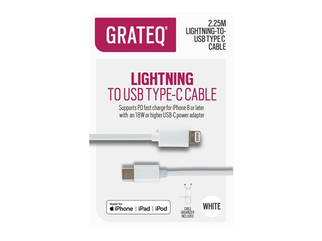 Produktbeskrivning GRATEQ Lightning-kabel - Lightning / USB - 2.25 m Kabel Lightning-kabel - Lightning / USB Längd 2.25 m Färg Vit Kontaktdon Lightning - hane Kontakt (andra änden) 24 pin USB-C - hane Egenskaper USB-strömförsörjning (18W) -