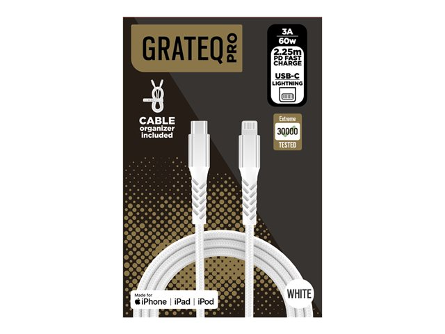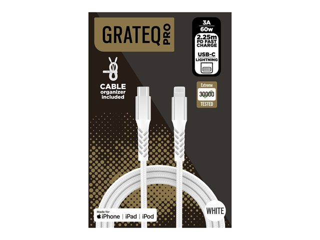 Produktbeskrivning GRATEQ PRO Lightning-kabel - Lightning / USB - 2.25 m Kabel Lightning-kabel - Lightning / USB Kabellängd 2.25 m Färg Vit Kontaktdon 24 pin USB-C - hane Kontakt (andra änden) Lightning - hane Märkström 3 A Egenskaper USB Power Delivery (60W), flätad kabel -