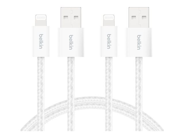 Produktbeskrivning Belkin BoostCharge Lightning-kabel - MFI-certifierad - 1.5 m Kabel Lightning-kabel Förpackad kvantitet 2 (specificationerna gällerenskild post) Längd 1.5 m Färg Vit Kontaktdon USB typ A - hane Kontakt (andra änden) Lightning - hane Egenskaper Trasselfri, flätad Tillverkarens garanti 2 års garanti -