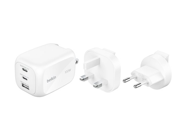 Strömadapter - GaN - 100 Watt - PD 3.1/PPS - 3 utdatakontakter (2 x USB-C, USB) - vit - med reseadapterkit