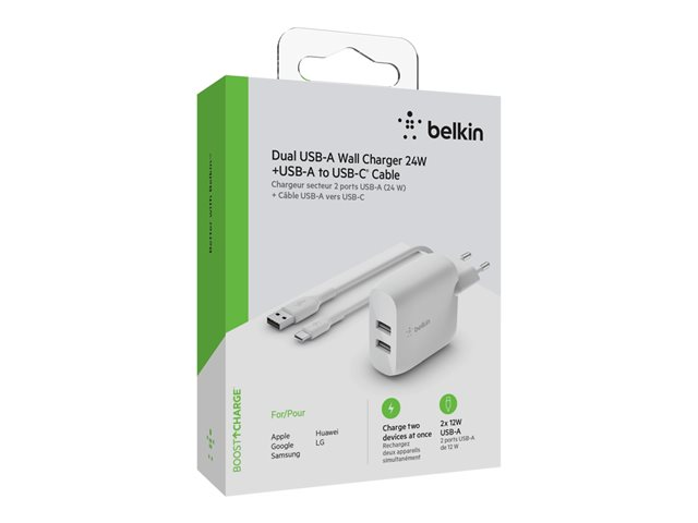 Produktbeskrivning Belkin BoostCharge strömadapter - USB - 24 Watt Typ av produkt Strömadapter Utformad för Surfplatta, mobiltelefon Färg Vit Typ av utkontakt Total 2: USB Effekt 24 Watt Kablar USB-C till USB-A-kabel - 1 m Tillverkarens garanti 2 års garanti -
