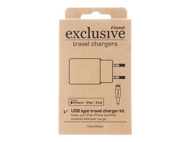 Produktbeskrivning Insmat travel charger strömadapter - USB Typ av produkt Strömadapter Dimensioner (BxDxH) 5.7 cm x 4.7 cm x 2.6 cm Typ av utkontakt USB Nätspänning AC 100-240 V Tillförd spänning 5 V Max elektrisk ström 2.4 A Kablar Lightning till USB-kabel - 1 m -