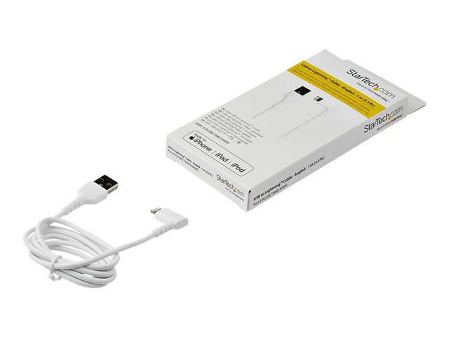 Produktbeskrivning StarTech.com 1m tålig USB-A till Blixtkabel - vitt 90° högervinkad, robust aramidfiber USB typ A till Blixtuppladdning/synkron sladd - Apple MFi-certifierad - iPhone - Lightning-kabel - Lightning / USB - 1 m Kabel Lightning-kabel - Lightning / USB Teknik Dubbelt skärmad Kabellängd 1 m Färg Vit Kontaktdon Lightning - hane - vinklad Kontakt (andra änden) USB - hane Egenskaper Synkronisering och laddning, klammer Tillverkarens garanti 2 års garanti -