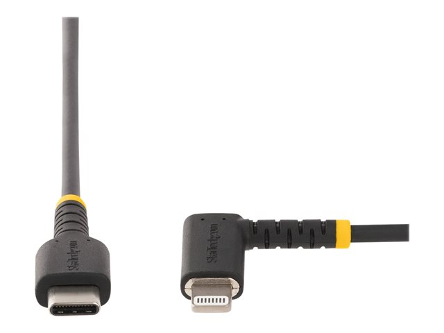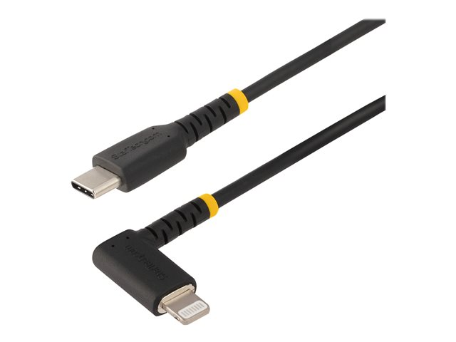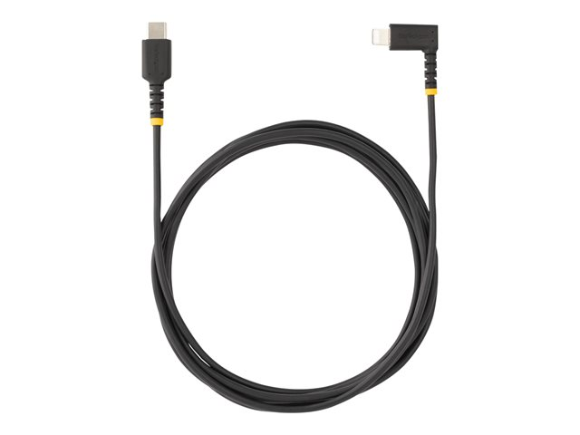 Produktbeskrivning StarTech.com 6ft (2m) Durable USB-C to Lightning Cable - Right-Angled Heavy Duty Aramid Fiber USB Type-C to Lightning Charging/Sync Cord - Apple MFi Certified - Rugged iPhone Lightning Cable - Lightning-kabel - 2 m Kabel Lightning-kabel American Wire Gauge (AWG) 22/32 Kabellängd 2 m Färg Svart Kontaktdon 24 pin USB-C - hane Kontakt (andra änden) Lightning - hane Standarder som följs USB / USB 2.0 Egenskaper Synkronisering och laddning, snabbladdande, aramidförstärkt kärna, EMI-skydd, tålig konstruktion, dragavlastande formpressning Tillverkarens garanti 2 års garanti -