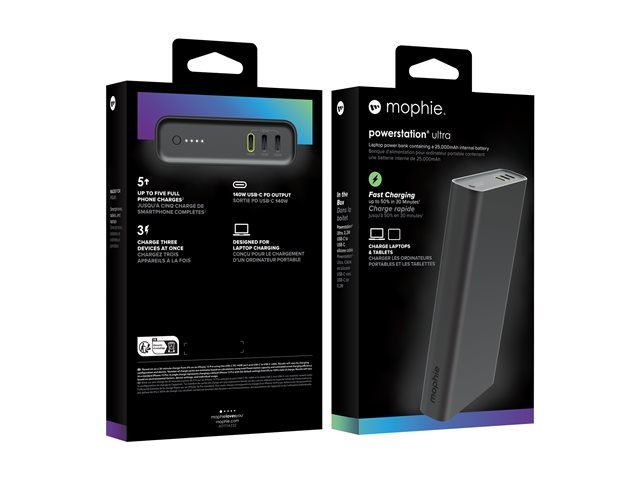 Produktbeskrivning mophie powerstation ultra strömförsörjningsbank - 24 pin USB-C - 140 Watt Typ av produkt Strömförsörjningsbank Utformad för Surfplatta, mobiltelefon, bärbar dator Vikt 454 g Färg Svart Typ av utkontakt Total 3: 24 pin USB-C Snabbladdningsteknik Power Delivery Batteri 25000 mAh Effekt 140 Watt Tillverkarens garanti 2 års garanti -