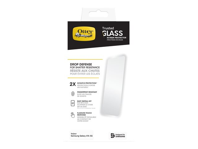 Produktbeskrivning OtterBox Trusted Glass - skärmskydd för mobiltelefon Typ av produkt Skärmskydd - glas Avsedd för Mobiltelefon Skydd Reptålig, splittertålig, kladdsäker, motstår fingeravtryck, droppskydd Produktmaterial Glas Dimensioner (BxDxH) 7.195 cm 16.08 cm Grovlek 0.69 mm Färg Klar Designat för Samsung Galaxy A14 5G -