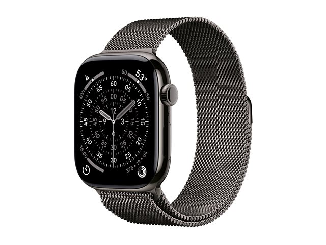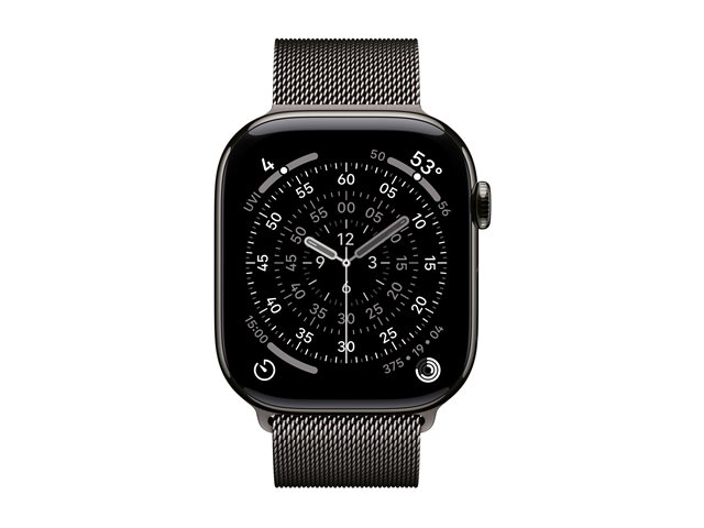 46 mm - skiffer titan - smart klocka med milanesisk loop - nät av rostfritt stål - skiffer - bandstorlek: M/L - 64 GB - LTE, Wi-Fi 4, UWB, Bluetooth - 5G - 43.1 g
