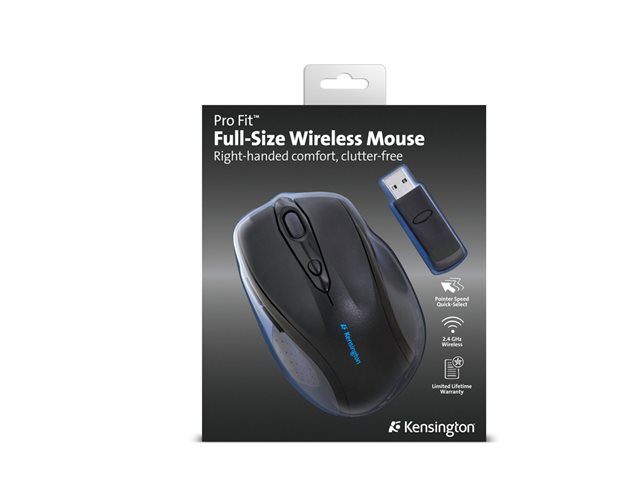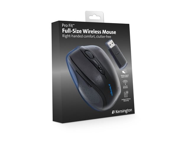 Produktbeskrivning Kensington Pro Fit Full-Size - mus - 2.4 GHz - svart Typ av enhet Mus Anslutningsteknik Trådlös - 2.4 GHz Färg Svart Inriktning Högerhänt Dimensioner (BxDxH) 7.8 cm x 12 cm x 4 cm Vikt 210 g Lokalisering Europa Trådlös mottagare Trådlös USB-mottagare Teknik för rörelsedetektering Optisk Antal knappar 6 Rörelseupplösning 1200 dpi Egenskaper Scrollhjul, mjukt gummihandtag Batteri 2 x AA-typ Operativsystem erfordras Apple MacOS X, Microsoft Windows 7, Microsoft Windows Vista / XP -