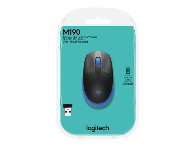 Produktbeskrivning Logitech M190 - mus - blå Typ av enhet Mus Anslutningsteknik Trådlös Färg Blå Dimensioner (BxDxH) 6.61 cm x 11.54 cm x 4.03 cm Vikt 89.9 g Lokalisering EMEA Trådlös mottagare Nano trådlös USB-mottagare Teknik för rörelsedetektering Optisk Antal knappar 3 Rörelseupplösning 1000 dpi Egenskaper Mekaniskt rullhjul Batteri AA-typ Operativsystem erfordras Microsoft Windows 7, Windows 10 eller senare, Apple MacOS X 10.10 eller senare, Linux 2.6 eller senare Tillverkarens garanti 2 års garanti -