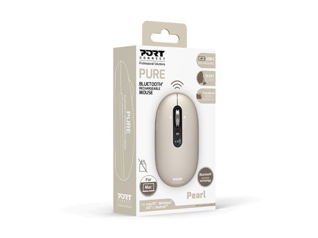 Produktbeskrivning PORT Connect PURE COLOR - mus - laddningsbar - Bluetooth - pärla Typ av enhet Mus Anslutningsteknik Trådlös - Bluetooth Färg Pärla Inriktning Höger- och vänsterhänta Dimensioner (BxDxH) 6.5 cm x 11 cm x 2.5 cm Vikt 85 g Teknik för rörelsedetektering Optisk Antal knappar 5 Rörelseupplösning 3200 dpi Prestanda Sensivitetsomkoppling i realtid 1000/1600/2400/3200 dpi Egenskaper Tyst klick, scrollhjul, FreeWheel-teknik, vänster och höger knappar Operativsystem erfordras Apple MacOS, Microsoft Windows, Apple iOS, Android Tillverkarens garanti 3 års garanti -