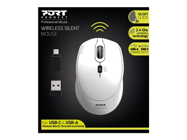 Produktbeskrivning PORT Connect SILENT - mus - 2.4 GHz - vit Typ av enhet Mus Anslutningsteknik Trådlös - 2.4 GHz Färg Vit Dimensioner (BxDxH) 6.5 cm x 9.9 cm x 3.7 cm Vikt 58 g Trådlös mottagare USB/USB-C trådlösa mottagare Teknik för rörelsedetektering Optisk Rörelseupplösning 1600 dpi Prestanda Realtidssensitivitetsomkoppling 800/1200/1600 dpi Egenskaper Tysta nycklar, scrollhjul Operativsystem erfordras Microsoft Windows, Apple MacOS, Android, Google Chrome OS Tillverkarens garanti 2 års garanti -