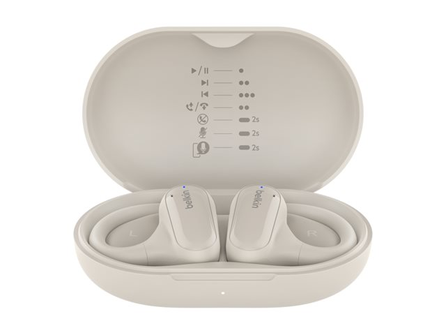 Produktbeskrivning Belkin SoundForm ClearFit - True wireless-hörlurar med mikrofon Typ av produkt True wireless-hörlurar - Bluetooth Kompatibilitet Mac, iPad, iPhone, Android-telefon, Android-surfplatta, Chrome OS, Windows Rekommenderad användning Bärbar elektronik, dator Ytterligare funktioner Trådlös ljuddelning Färg Sand Hörlursmodell Öppet öra - montering över örat Trådlös teknik Bluetooth Bluetoothversion Bluetooth 5.3 Ljudutgångsläge Stereo Ljudeffekter Signaturmelodi Brusreducerande mikrofon Ja Inkluderade mikrofoner 4 Kontroller Spela/pausa, nästa/föregående låt, volym, svara/avsluta, avvisa samtal, stänga av ljud, röstassistent Intelligent assistent Indirekt Tillverkarens garanti 2 års garanti -