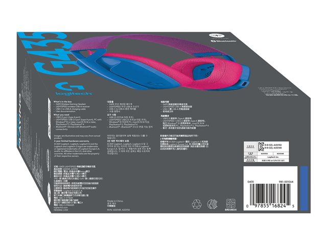 Produktbeskrivning Logitech Lightspeed G435 - headset Typ av produkt Headset - Bluetooth/radiofrekvens 2,4 GHz - trådlös Rekommenderad användning Spelkonsol, dator Färg Blå Hörlursmodell Fullstorlek Anslutningsteknik Trådlös Trådlös teknik Bluetooth/radiofrekvens 2,4 GHz Ljudeffekter Windows Sonic surroundljud Ljudspecifikationer Frekvensrespons 20 - 20000 Hz - Sensitivitet 83.1 dB/mW Impedans 45 ohm Operativt läge för mikrofon Strålformning Mjukvarucertifiering Discord-certifierad -