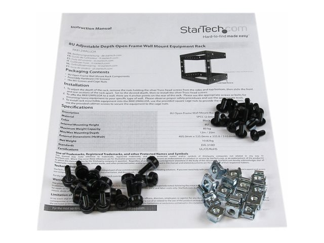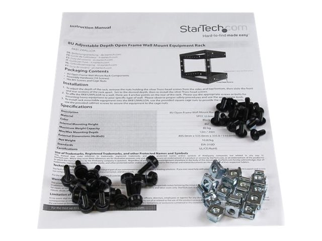 Produktbeskrivning StarTech.com 8U 19" Wall Mount Network Rack - 12" Deep 2 Post Open Frame Server Room Rack for Data/AV/IT/Computer Equipment/Patch Panel with Cage Nuts & Screws 135lb Capacity, Black (RK812WALLO) - rack - 8U Produkttyp Rack Färg Svart Stativstorlek 19" Höjd (U-format) 8U Produktmaterial Stål Dimensioner (BxDxH) 50.5 cm x 30.8 cm x 35.6 cm Vikt 8 kg Designat för P/N: CABCAGENUTS6, CABSCREWM5, CABSCREWM52, CABSCREWM6, CABSCREWM62, CABSCREWS, CABSCREWSM6, CABSCRWM520, CABSCRWM620, CABSCRWS1224 -