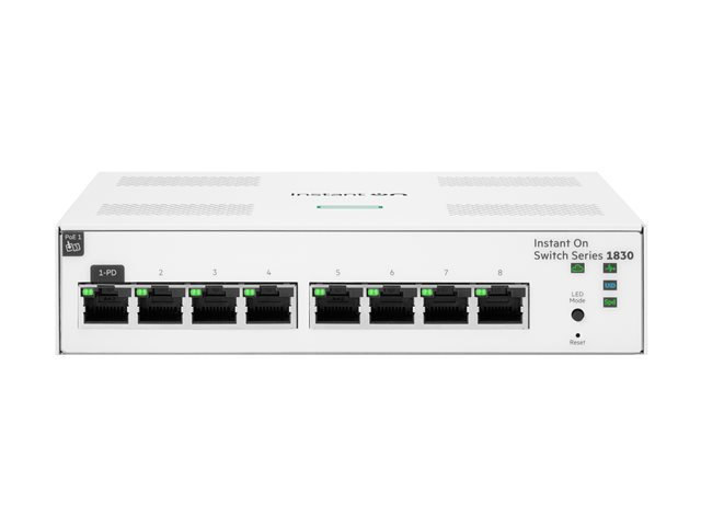 Produktbeskrivning HPE Networking Instant On 1830 8G Switch - switch - 8 portar - smart Typ av enhet Switch - 8 portar - smart Undertyp Gigabit Ethernet Portar 8 x 10/100/1000 Prestanda Latens (100 Mbps): 5.2 µs