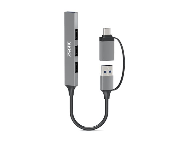 Produktbeskrivning PORT Connect - hubb - USB-C/USB-A, slimmad - 4 portar Typ av enhet Hubb - 4 portar Undertyp USB Portar 3 x USB 2.0 + 1 x SuperSpeed USB Prestanda Maximal datatakt (USB 2,0): 480 Mbps