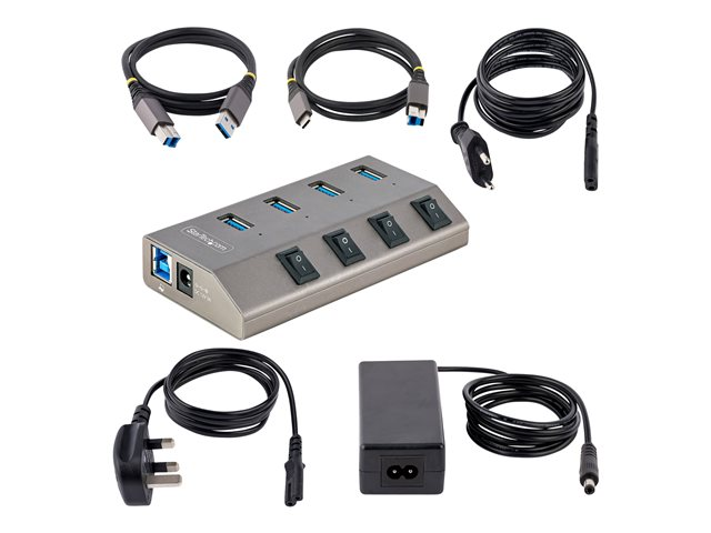 Produktbeskrivning StarTech.com 4-Port Self-Powered USB-C Hub with Individual On/Off Switches, USB 3.0 5Gbps Expansion Hub w/Power Supply, Desktop/Laptop USB-C to USB-A Hub, 4x BC 1.2 (1.5A), USB Type C Hub - USB-C/A Host Cables (5G4AIBS-USB-HUB-EU) - hubb - 4 portar Typ av enhet Hubb - 4 portar Undertyp USB Portar 4 x USB 3.2 Gen 1 Funktioner Stöd för snabbladdning, 4 på-/av-knappar, aluminiumhus, egendrivet läge, CDP, DCP Standarder som följs USB 3.2 Gen 1, USB 3.0, USB 2.0, USB 1.1, Battery Charging 1.2 Strömtillförsel AC 110-240 V Dimensioner (BxDxH) 11.4 cm x 5.9 cm x 2.1 cm Vikt 128 g Systemkrav Android, Apple iPadOS, Apple MacOS, Google Chrome OS, Microsoft Windows Lokalisering Europa, Storbritannien Tillverkarens garanti 2 års garanti -